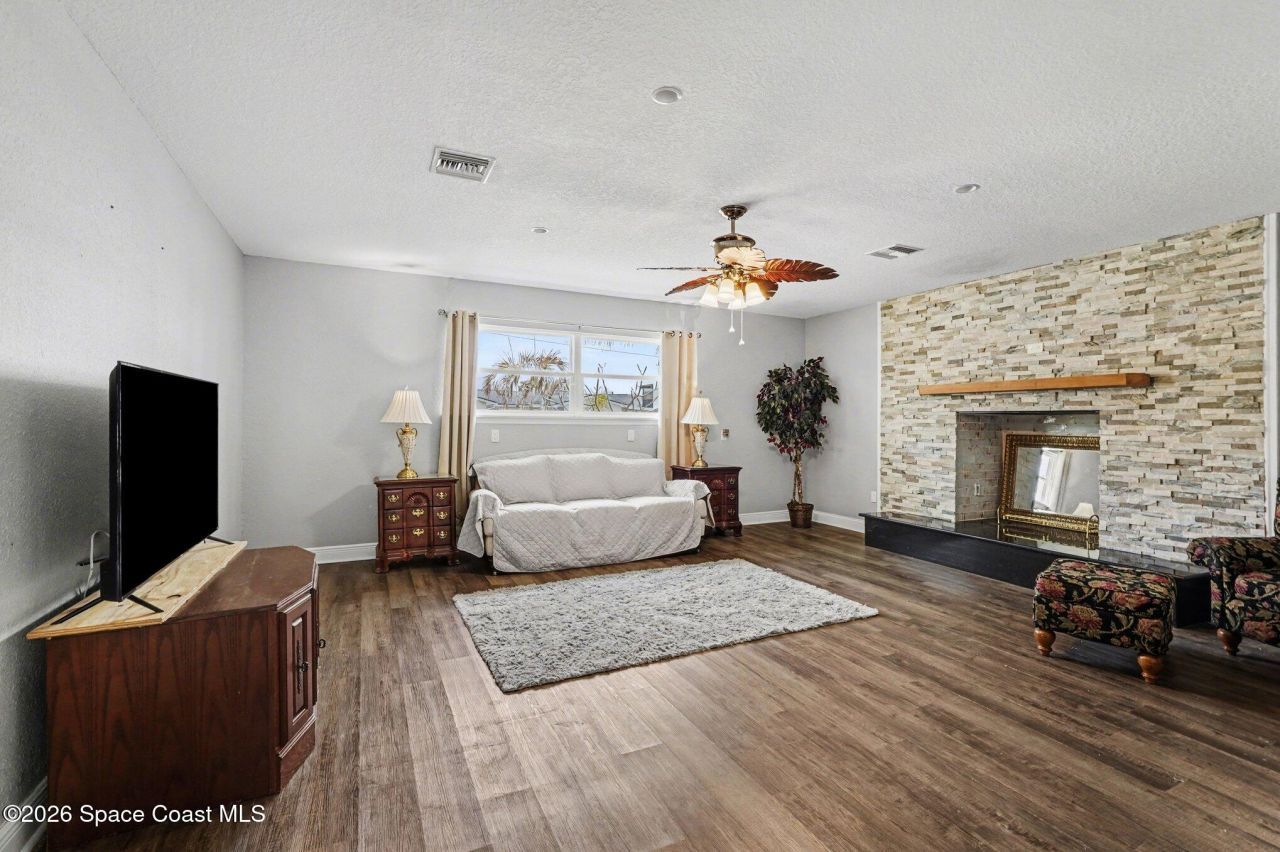 In the heart of Merritt Island, this happy home is made for laughter, lounging & lazy weekends. The kitchen sits right in the heart of it all--perfect for cooking up a homecooked meal for a crowd or ordering Ubereats & calling it chefs choice. The split floorplan gives everyone their own space, making movie nights peaceful & mornings calm. Cozy up by the electric fireplace, soak in the sunshine through dbl pane windows, & enjoy a worry-free life w/ 2 ACs (both 2018) & a 2021 roof. The extended 2-car garage is perfect for all your toys, tools & treasures, while the homes handicap accessibility adds thoughtful convenience. A short stroll takes you to a scenic waterfront park where you can watch sunsets, feed ducks, or just breathe it all in. This is the kind of home that feels like a deep sigh of contentment--easy, comfortable & full of heart.